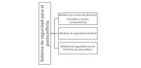 La Fundación Paz y Reconciliación propone, para asumir los retos anteriormente descritos, crear un Sistema de seguridad para el Postconflicto. Este modelo se compondrá de tres subsistemas. El siguiente mapa muestra la complejidad del mismo: