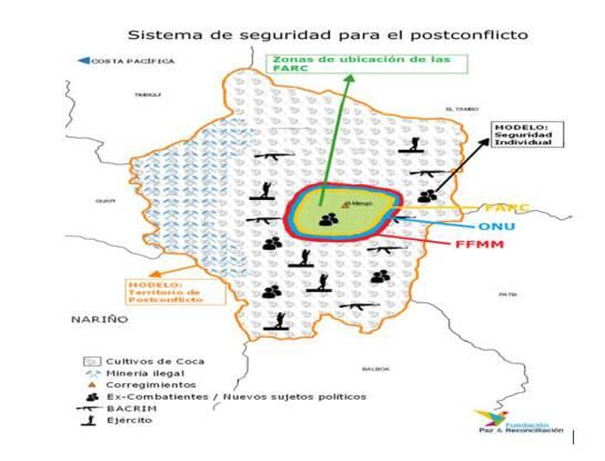 El modelo de seguridad para las zonas de ubicación está absolutamente claro y es bastante bueno. Las mismas tendrán 3 anillos de seguridad. En el interior de la zona la protección se las da las Farc. Inmediatamente después y en un espacio de un kilómetro estará el segundo anillo que es el mecanismo de verificación de Naciones Unidas y después de esto viene e tercer anillo que es el de las Fuerza Militares. Igualmente el esquema de seguridad individual está claro, habrá seguridad para los jefes de las Farac con equipos de protección mixtos. Mientras que para el modelo de seguridad rural del postconflicto no hay nada claro. El esquema sería el siguiente: