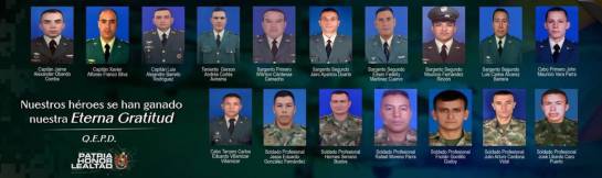 “Son unos héroes de la patria, por eso es que nos duele tanto lo ocurrido. Es como si nos partieran en pedazos el corazón y el alma de la institución. Quiero trasmitir un mensaje de una solidaridad muy grande, muy especial, de cariño y aprecio a las familias de estos 17 héroes de la patria”, resumió Mejía.