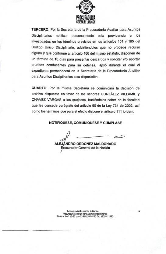 De otra parte le archivó a Jorge Enrique Navarrete Jadet, comandante de Primera División.