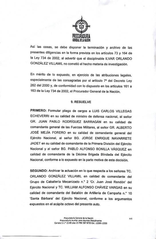 La decisión también cobija al general Juan Pablo Rodríguez, comandante general de las Fuerzas Militares; Alberto José Mejía Ferrero, comandante General del Ejército de la República;Pablo Alfonso Bonilla Vásquez, comandante de la Décima Brigada Blindada.