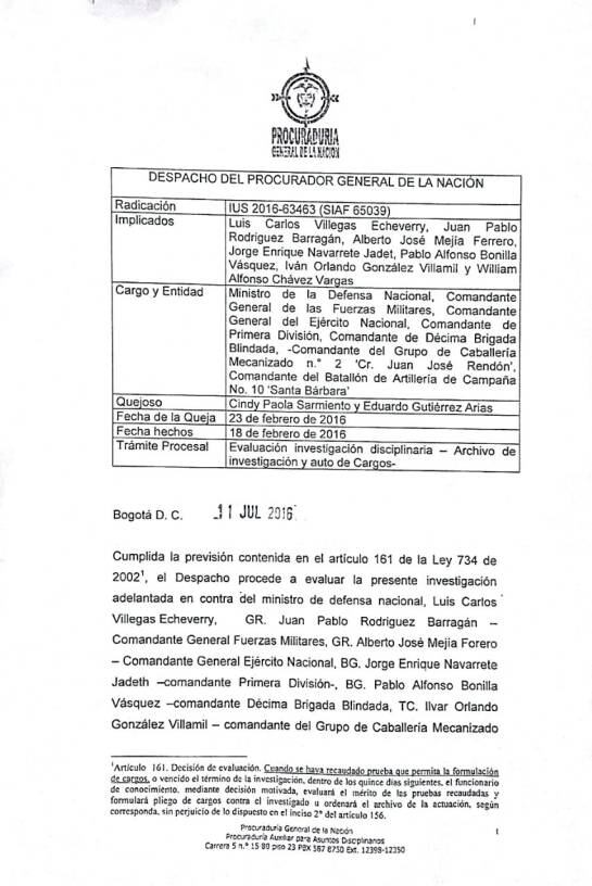 El documento ya fue firmado y en este se busca determinar si se presentaron faltas disciplinarias por haberse retirado a la Fuerza Pública, durante el tiempo que estuvo la guerrilla de las Farc en el corregimiento Conejo, lo cual podría constituir una violación a la Ley 418 de 1997 que en el parágrafo 1º del artículo 8º prescribe que “en ningún caso podrán establecerse órdenes especiales de localización a la Fuerza Pública para la creación específica de zonas de ubicación o de despeje de cualquier parte del territorio nacional”.