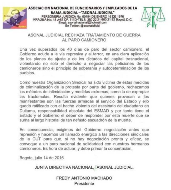 Un fuerte rechazo hicieron los miembros de Asonal Judicial a las medidas tomadas por el Gobierno y las autoridades frente al paro camionero que ya completa 40 días, dicen que se está violentando el derecho a negociar y las peticiones de los trasportadores.