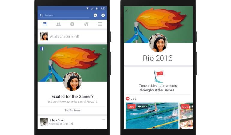 Cuando vea un saludo de algún amigo o alguna página de un famoso en su ‘timeline’, tendrá la opción de hacer clic e ingresar a una página con contenido dinámico sobre las Olimpíadas: resultados de búsqueda relacionados con las Olimpíadas y conversaciones, Eventos, videos Live desde Río y mucho más.