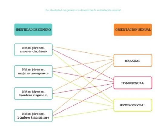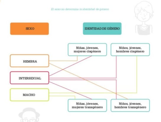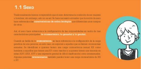 En un primer capítulo, titulado ¿Qué son y cómo aprender las orientaciones sexuales e identidades de género en la escuela?, el texto explica qué se debe entender por sexo, género, identidad de género, expresión de género y orientación sexual.