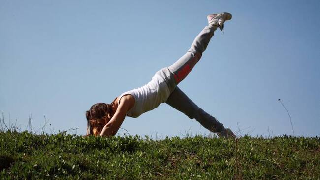 Este ejercicio puede hacerse en pareja o utilizando un soporte ya que se requiere de equilibrio y buena postura.