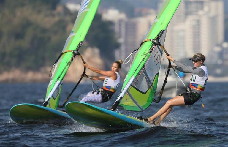 Las danesas Laerke Buhl-Hansen y Angeliki Skarlatou compiten en Vela en los Juegos Olímpicos de Río 2016.
