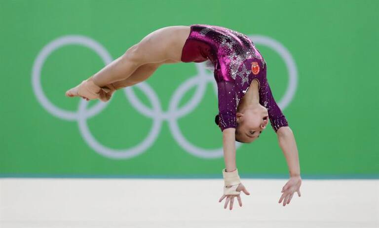Wang Yan de China compite en las pruebas de piso de gimnasia.