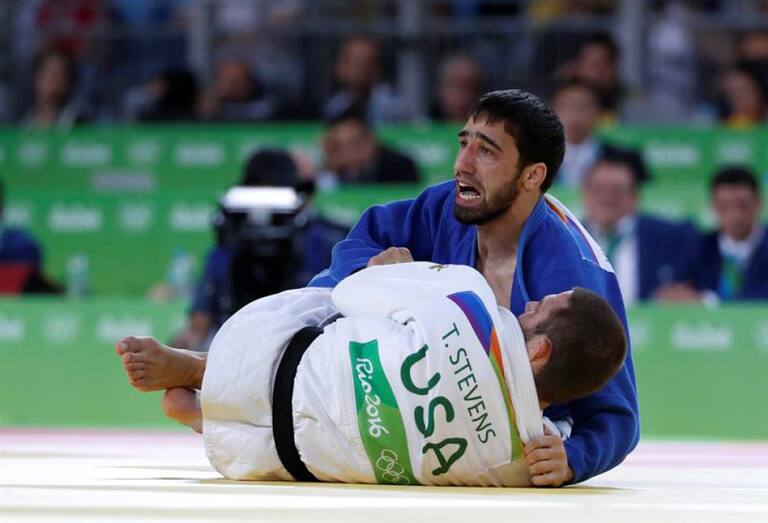 Khasan Khalmurzaev (azul) de Rusia celebra tras vencer a Travis Stevens (blanco) de EE.UU. en la competencia de judo hombres 81 kg, durante los Juegos Olímpicos Río 2016.