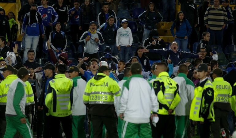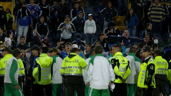 Debido a los altercados provocados por los hinchas de Millonarios en el partido adelantado por la fecha 14 ante el Bucaramanga, Jorge Perdomo Presidente de la División Mayor del Fútbol Profesional, sancionó al club embajador con cuatro fechas a puerta cerrada, la pérdida del partido cero por tres (0-3) y una multa de 18 millones de pesos.