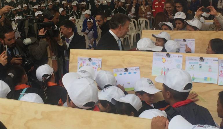 El presidente de la República Juan Manuel Santos en compañía de la primera dama María Clemencia Rodríguez y la ministra de Educación Gina Parody, lanzaron en Bogotá el concurso "Pinta una Colombia en Paz" con el cual se busca que los niños muestren su visión de un nuevo país.