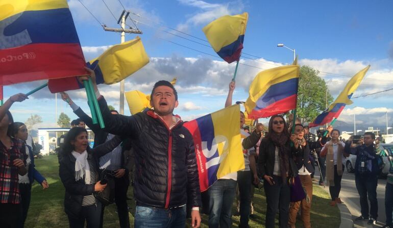 El profesor Antanas Mockus, movilizó a cientos de jóvenes que respaldan el Si a la paz para recibir a los negociadores del Gobierno que llegaron este viernes a Colombia, procedentes de Cuba.
