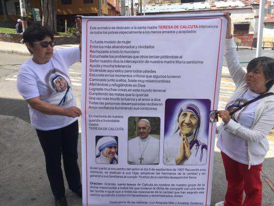 Una procesión y una misa se llevó a cabo en la parroquia de ‘Jesucristo Obrero’ del barrio La Perseverancia. Justo al lado de la iglesia está el convento de 'Las Hermanitas de la Caridad’, allí vive un grupo de religiosas que han predicado el legado de sor Teresa de Calcuta, las hermanas que se distinguen por vestir una habito blanco con rayas azules celebraron la decisión del papa Francisco quien proclamó como santa a la madre Teresa.