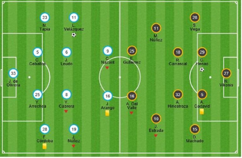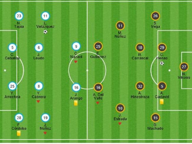 La anotación de los visitantes llegó a los 27 minutos. Carlos Henao cobró un potente tiro libre y abrió el marcador.
