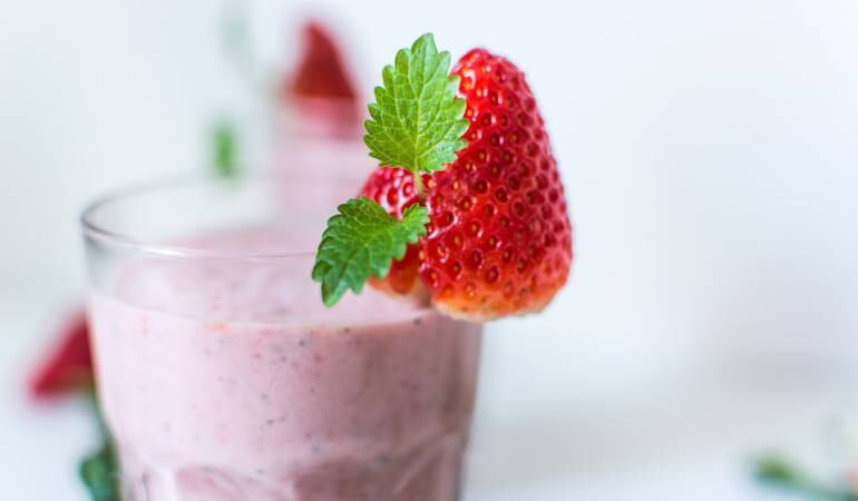 10 fresas, ½ banano, una cucharada de proteína en polvo y un vaso de bebida de soya.