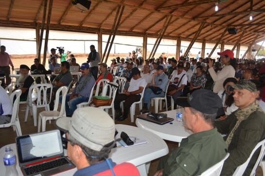 El recinto donde se reúnen es en guadua, tejas de zinc, palmicha, baños señalizados en inglés y español. Todos los guerrilleros permanecen sentados, atentos, apuntando en sus cuadernos porque de allí saldrá el génesis de las Farc en la política.