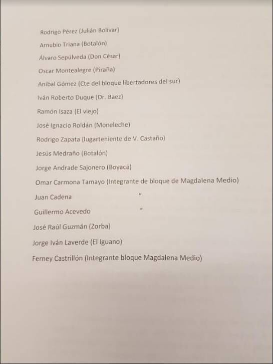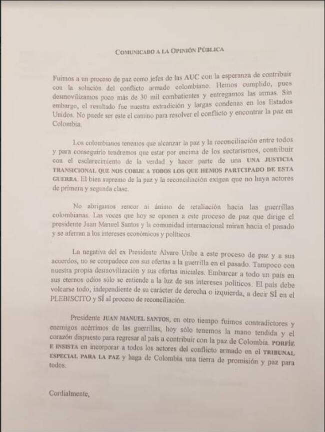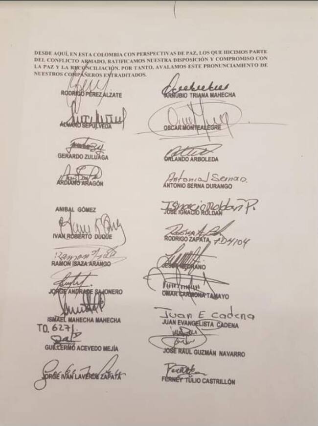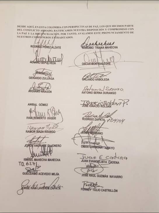 Sin embargo, en la misiva recordaron que cuando ellos hicieron un proceso similar con el entonces presidente Álvaro Uribe Vélez, pese a que se desmovilizaron y entregaron las armas, el resultado “fue la extradición a Estados Unidos”. El documento que fue revelado por la W Radio, está firmado por varios exjefes paramilitares entre ellos, Ramón Isaza, Rodrigo Pérez Alzate, Iván Roberto Duque, entre otros.