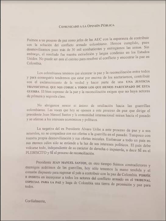 A través de una carta varios exjefes paramilitares recluidos en cárceles de Estados Unidos y Colombia, expresaron su apoyo al proceso de paz que se adelantó entre el Gobierno y las Farc.