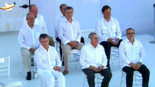 Lo acompañaban dos pequeños y detrás él los invitados especiales a este evento en el que también tenían un espacio protagónico, Rodrigo Londoño, “Timochenko”, el máximo cabecilla de las Farc, los presidentes de Chile, Venezuela, Ecuador, Cuba y el delegado de Noruega, naciones que han sido garantes y acompañantes de 6 años de negociaciones, dos en secreto y 4 en La Habana.