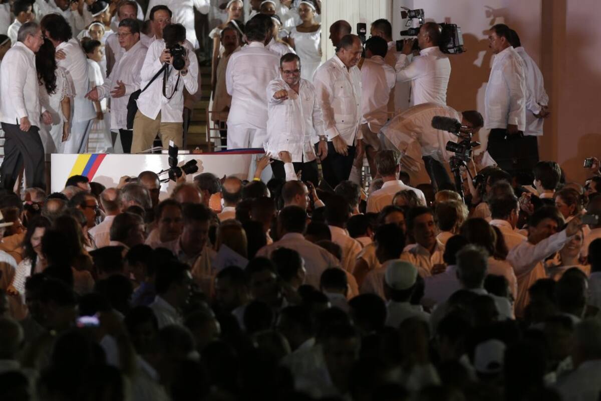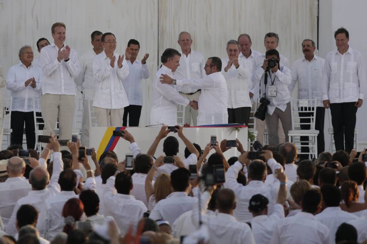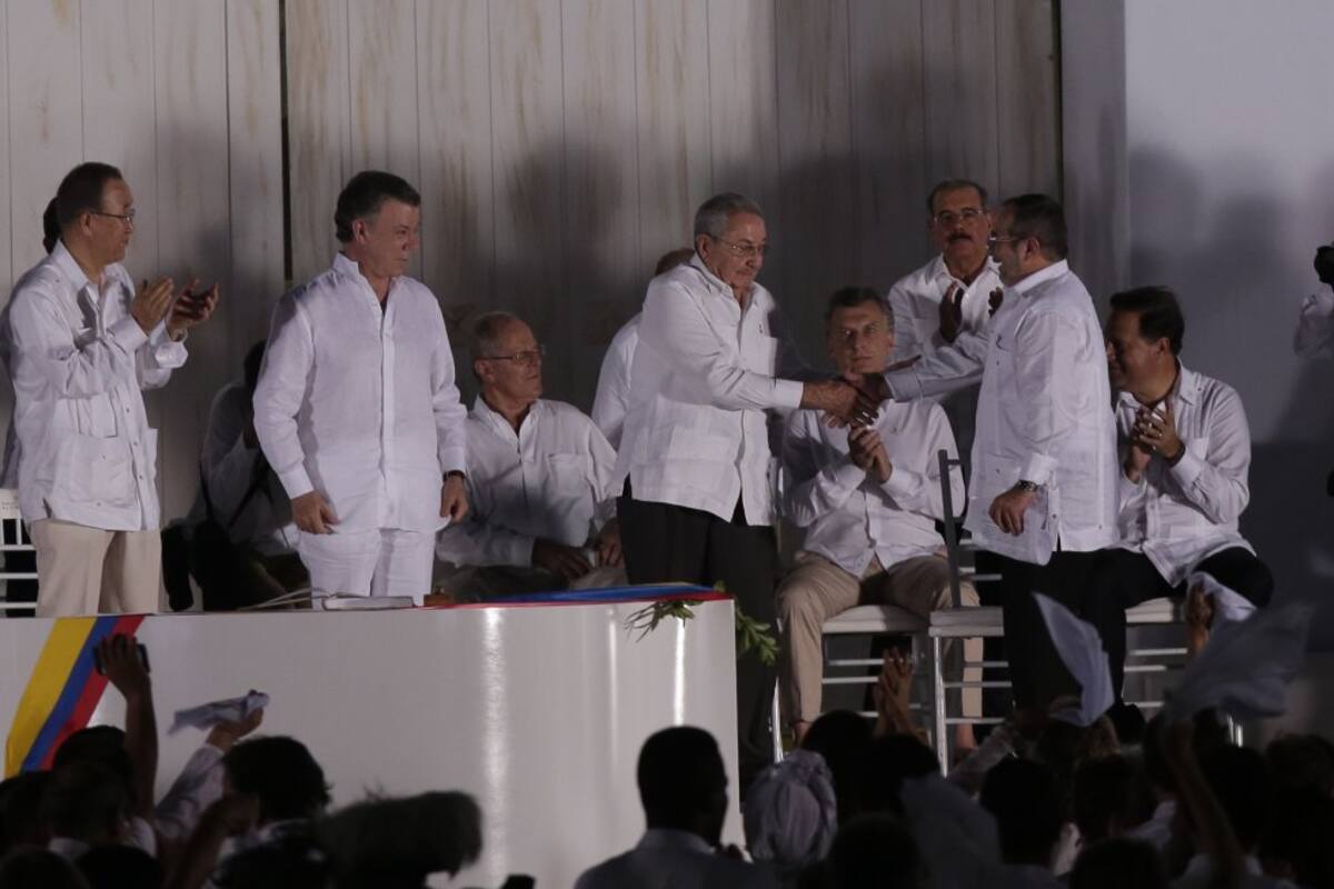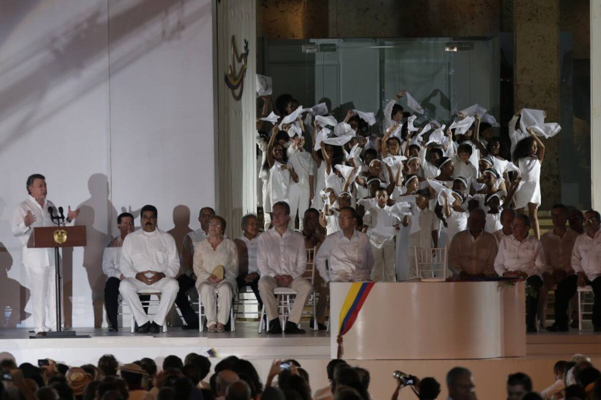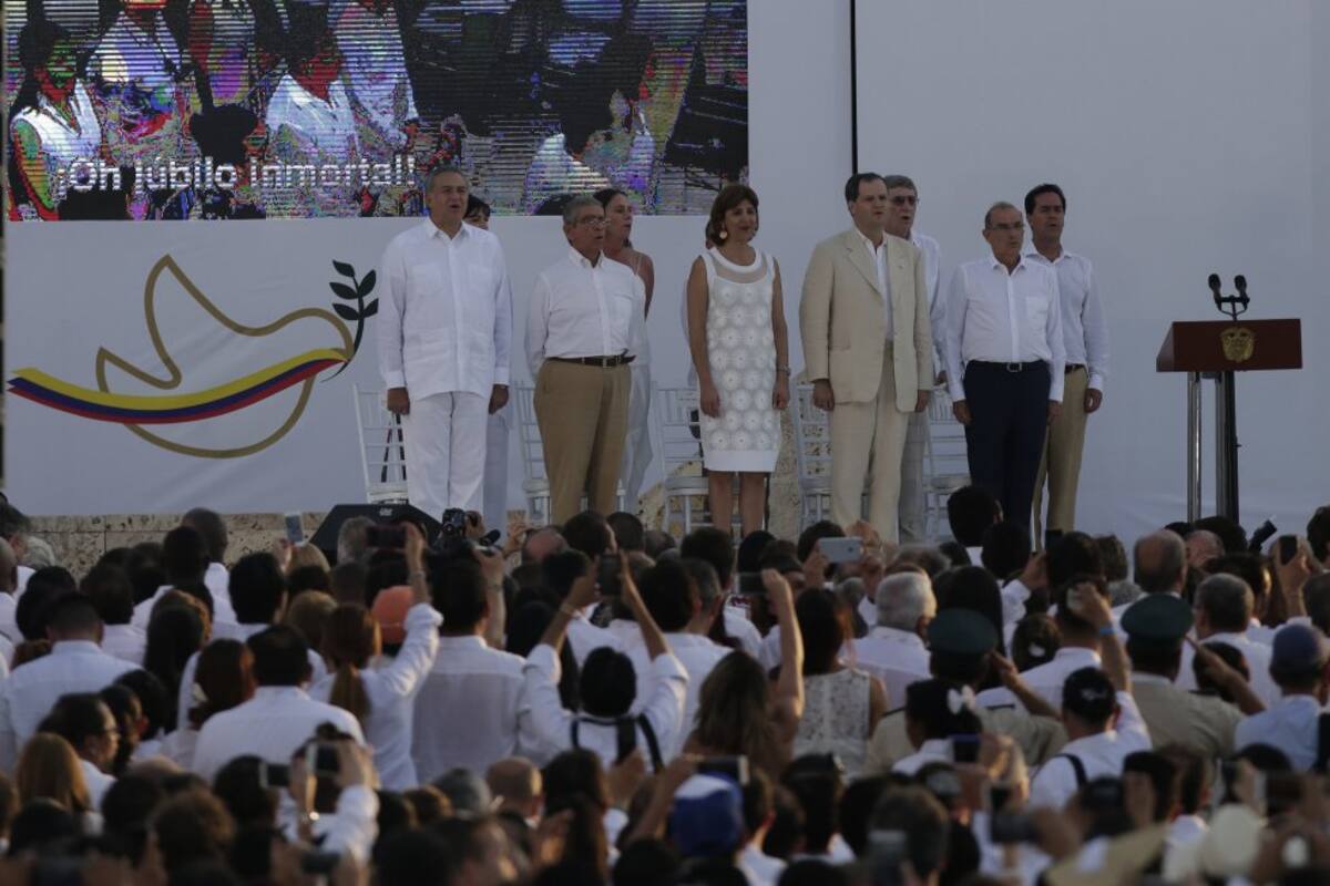 En el escenario principal se ubicaron el presidente Santos, Rodrigo Londoño, los negociadores de los dos bandos y presidentes invitados.