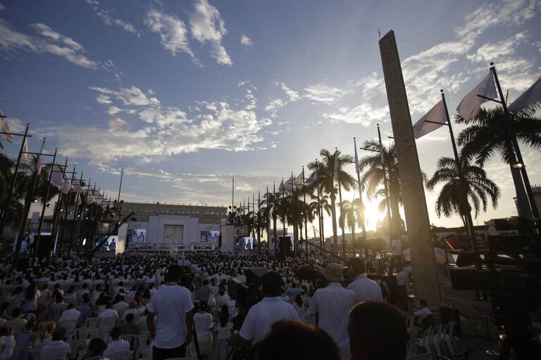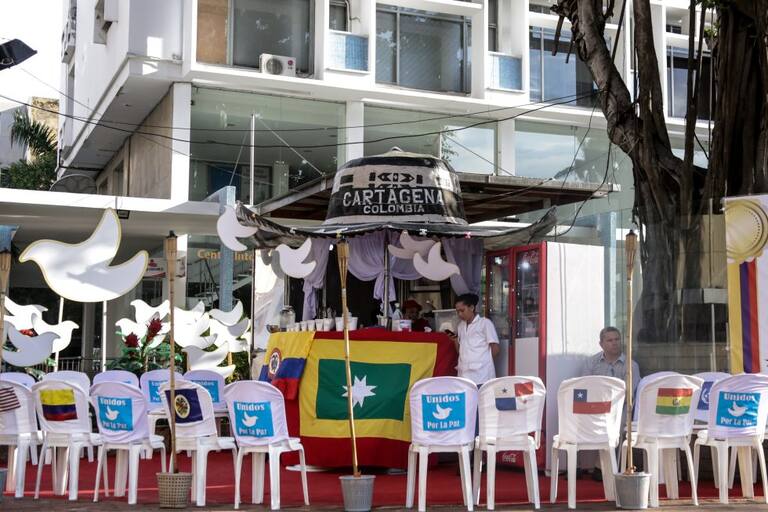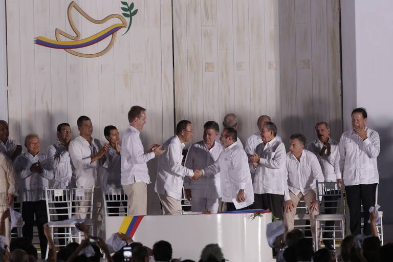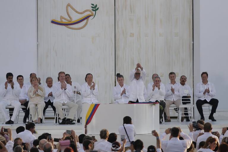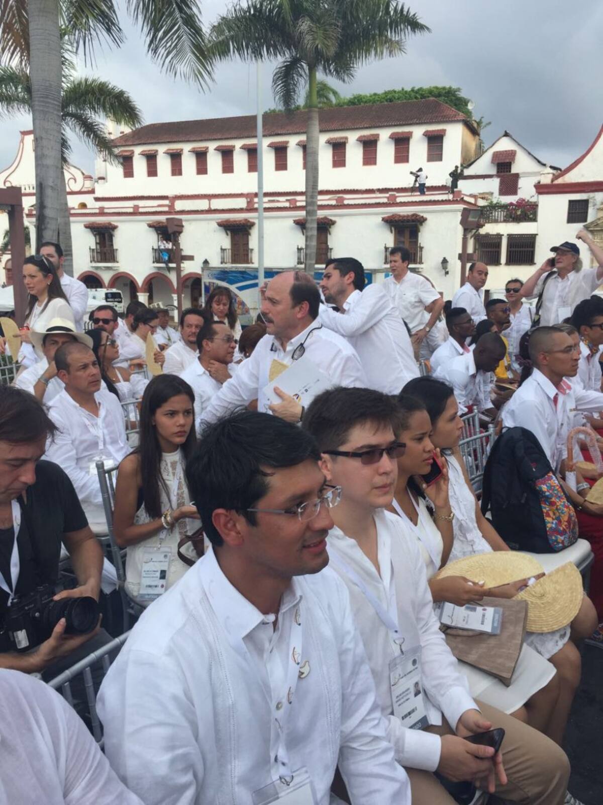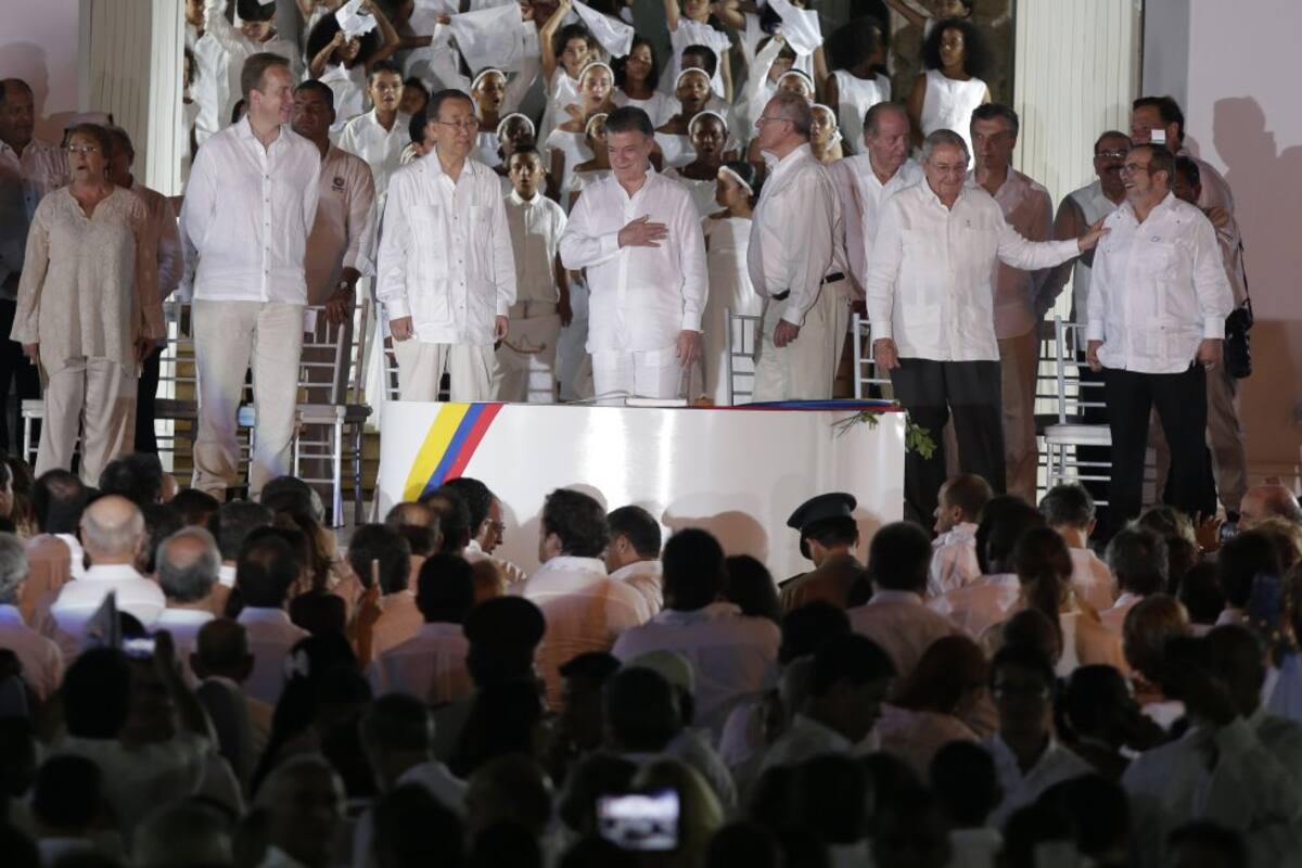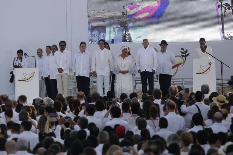 En el escenario principal se ubicaron el presidente Santos, Rodrigo Londoño, los negociadores de los dos bandos y presidentes invitados.