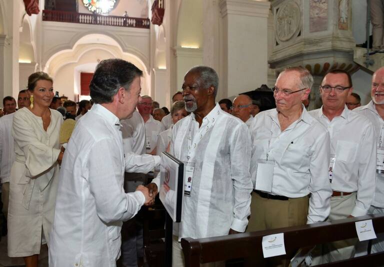 En los actos previos, el presidente Santos también tuvo ocasión para saludar al ex secretario de la Ono Koffi Annan