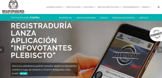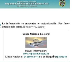 A pocos días de que se adelante el plebiscito en el que los colombianos podrán decir Sí o No a lo acordado en La Habana, la página de la Registraduría Nacional presentó varios errores que impedían verificar el sitio de votación e incluso en ocasiones aparecía que el ciudadano de la consulta estaba fuera del censo por haber muerto.