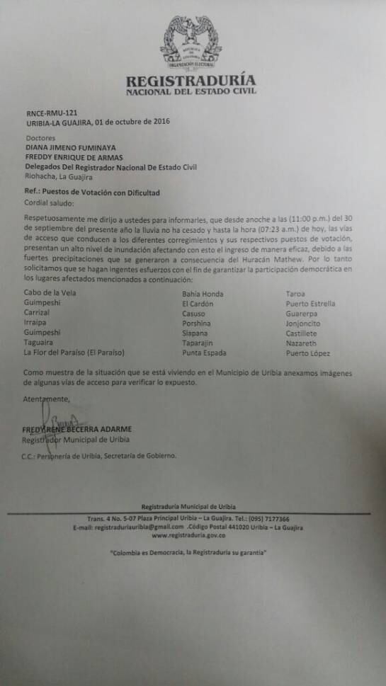 En la misiva conocida por Caracol Radio, el Registrador local pide que se hagan ingentes esfuerzos con el fin de garantizar la participación democrática en los lugares afectados.