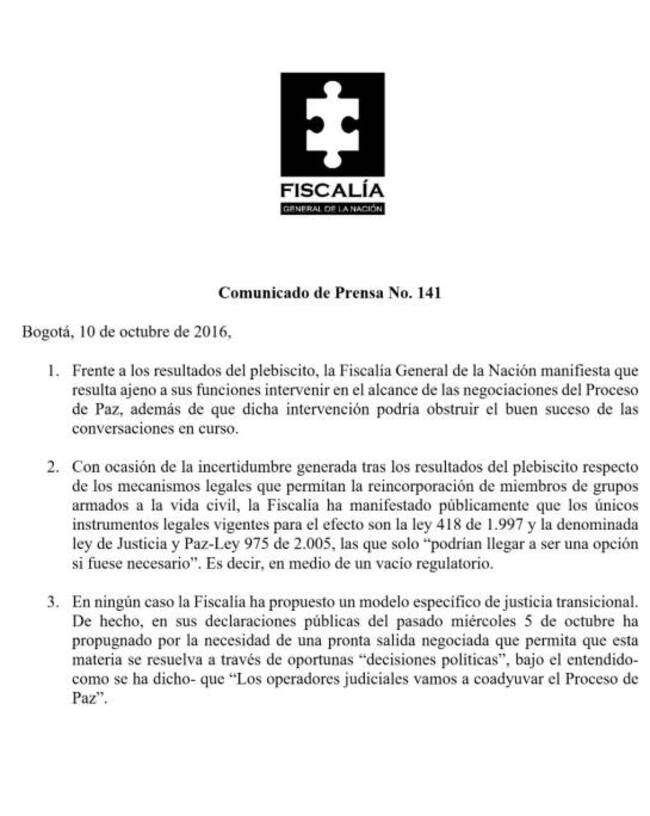Ahora y a través de un comunicado la Fiscalía aseguró que no han propuesto nuevos modelos de justicia transicional y que en sus funciones no se incluye intervenir en el alcance de las negociaciones del proceso de paz, menos en los resultados del plebiscito.