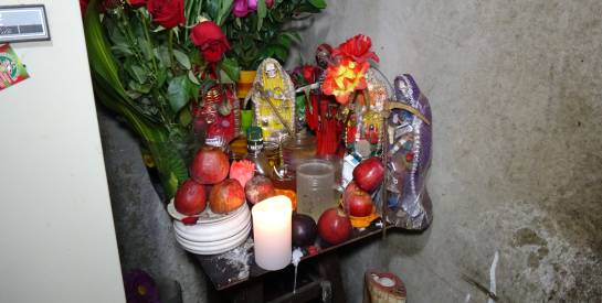Había un altar con manzanas, collares, flores rojas, veladoras, vasos con agua, el yeso del Ángel San Gabriel y la imagen de la Santa Muerte, una figura mexicana que personifica la muerte y atiende- según las creencias- peticiones de amor, dinero, surte protección.