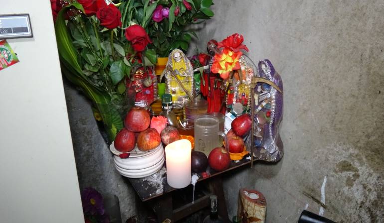 En la cocina de la vivienda, en una esquina, estaban dos yesos con la imagen macabra. La adornaban flores rojas, velones, parafina de colores esparcida en el suelo, una botella de aguardiente, manzanas y billetes. En uno de los cuartos, otra imagen de La ‘Santa Muerte’ permanecía cubierta con billetes de lotería al revés.