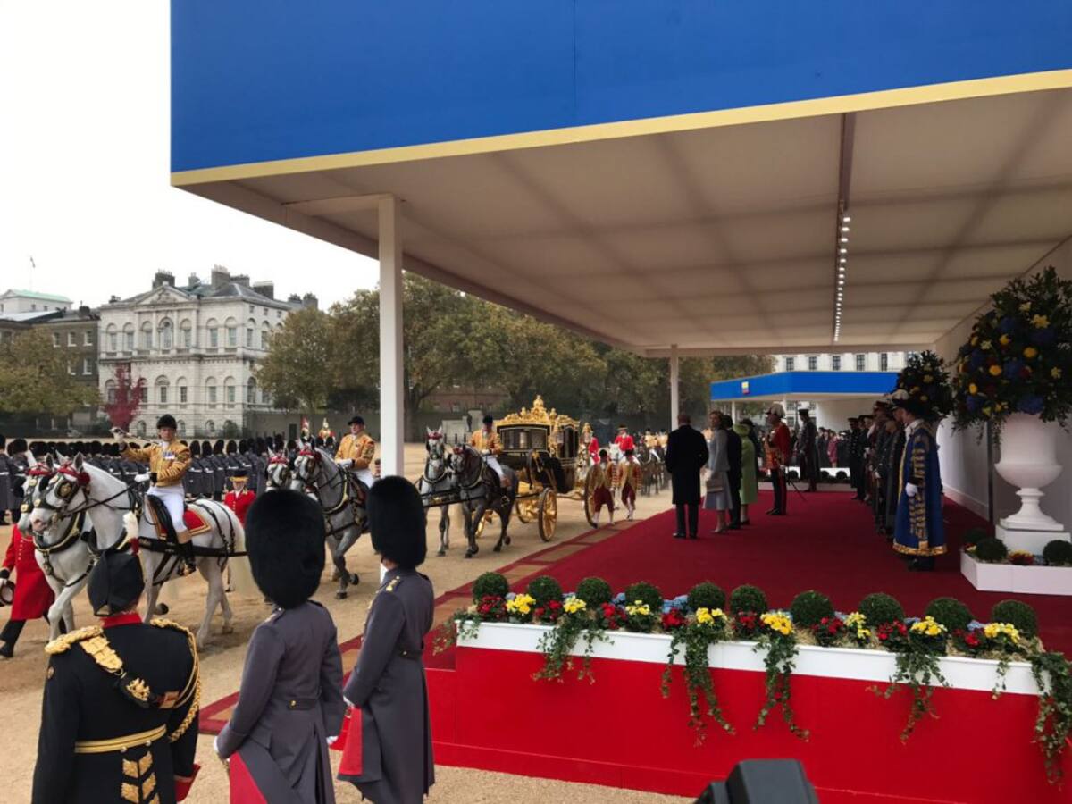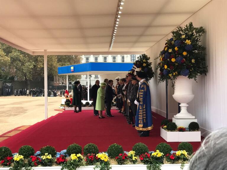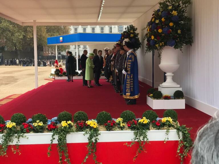 A continuación, con toda la pompa que requiere la ocasión, la soberana británica y el duque de Edimburgo han dado la bienvenida formal a este país al político colombiano en el Pabellón Real.