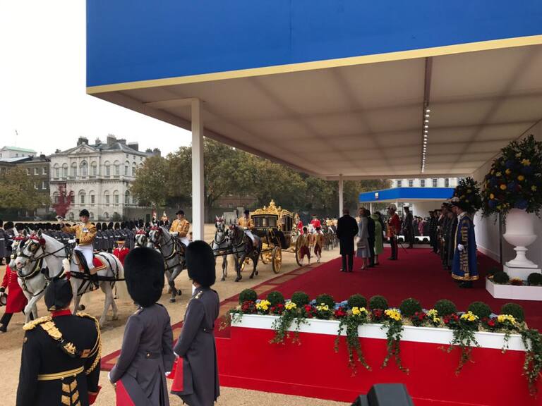 El presidente, que recientemente fue nombrado Premio Nobel de la Paz, fue recibido a primera hora en el Hotel Rosewood por el príncipe Carlos, heredero al trono británico, y su esposa, la duquesa de Cornualles, y con ellos se dirigió al campo de desfiles Horse Guards Parade, donde se les ha recibido con honores ceremoniales.