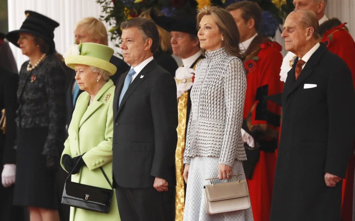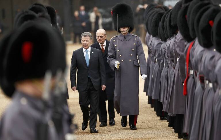La reina Isabel II y su esposo, el príncipe Felipe, dieron este martes la bienvenida formal al presidente de Colombia, Juan Manuel Santos, al inicio de su visita de Estado al Reino Unido, la primera de un gobernador colombiano a este país.