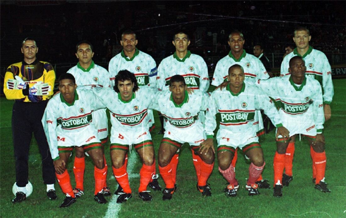 Parados de izq a der: Óscar ‘La Moña’ Galvis, Diego Sanclemente, Jorge Gutiérrez, Jairo Martínez, Óscar Díaz, Farley Hoyos. Abajo, en el mismo orden: Edgar Valencia, Carlos ‘El Chileno’ Molina, Néstor ‘El Palmira’ Salazar, Ángel Escobar y Rubiel Quintana.