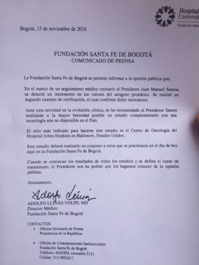 El presidente Juan Manuel Santos confirmó que viajará a Estados Unidos para realizarse unos exámenes luego de la recomendación médica de las directivas de la Fundación Santa Fe.