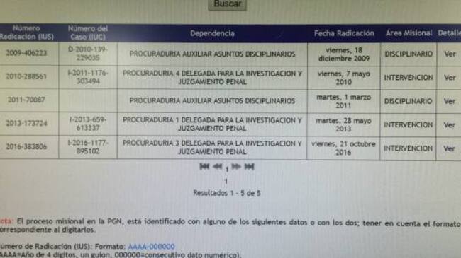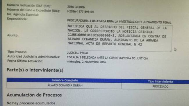 Aunque el reporte señala que la noticia criminal 110016000102201600366-3 está en el despacho del Fiscal General, fuentes de la fiscalía señalaron que esta fue trasladada a la Unidad de Fiscales Delegados ante la Corte. (Ver foto)