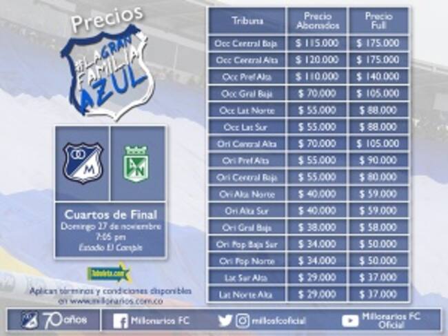 Millonarios dio a conocer los precios de la boletería para el juego de ida ante Atlético Nacional este domingo en Bogotá por los cuartos de final de la Liga Águila.