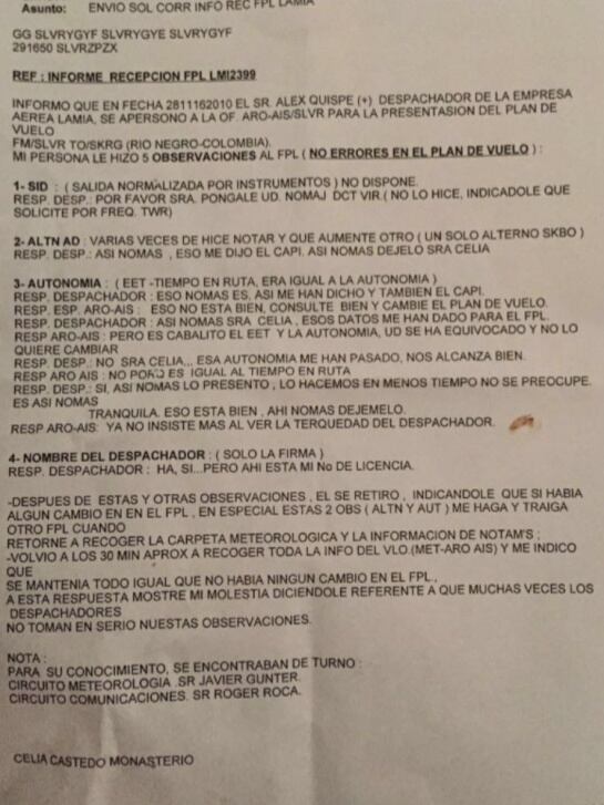 Ante la insistencia de la funcionaria Castedo de que se modificara el nivel de combustible y se aumentara a dos los aeropuertos alternos el despachador de LaMia se retiró y regresó 30 minutos después con el mismo plan de vuelo.