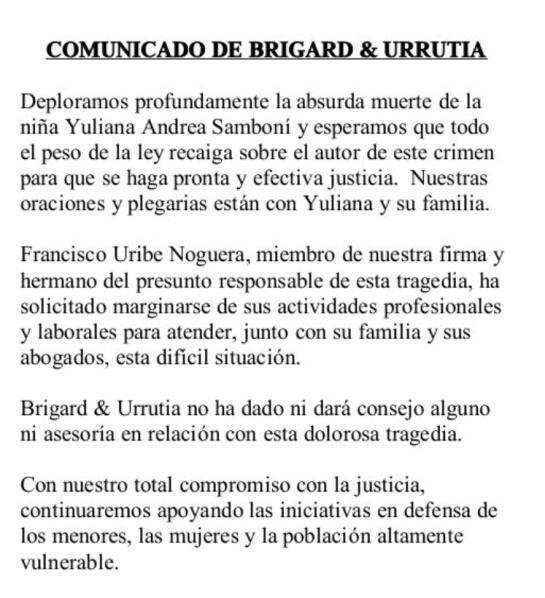 "Francisco Uribe Noguera, miembro de nuestra firma y hermano del presunto responsable de esta tragedia, ha solicitado marginarse de sus actividades profesionales y laborales, para atender, junto con su familia y sus abogados, esta difícil situación”, señala el comunicado.