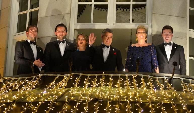 El premio nobel Santos salió al balcón del Grand Hotel, saludó a la multitud visiblemente emocionado, lo acompañó en seguida su esposa María Clemencia Rodríguez y sus 3 hijos, agradeció y tomó las manos de su familia como un símbolo de la reconciliación que necesita el país.