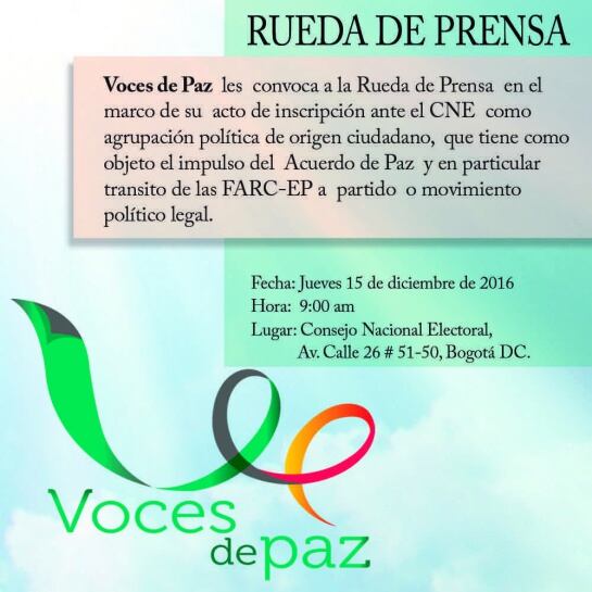 Caracol Radio conoció que este jueves ante el Consejo Nacional Electoral se inscribirá la agrupación política ciudadana que impulsará el Acuerdo Final para la Terminación del Conflicto y en particular el tránsito de las Farc a partido o movimiento político legal. Tendrá el nombre de Voces de Paz.