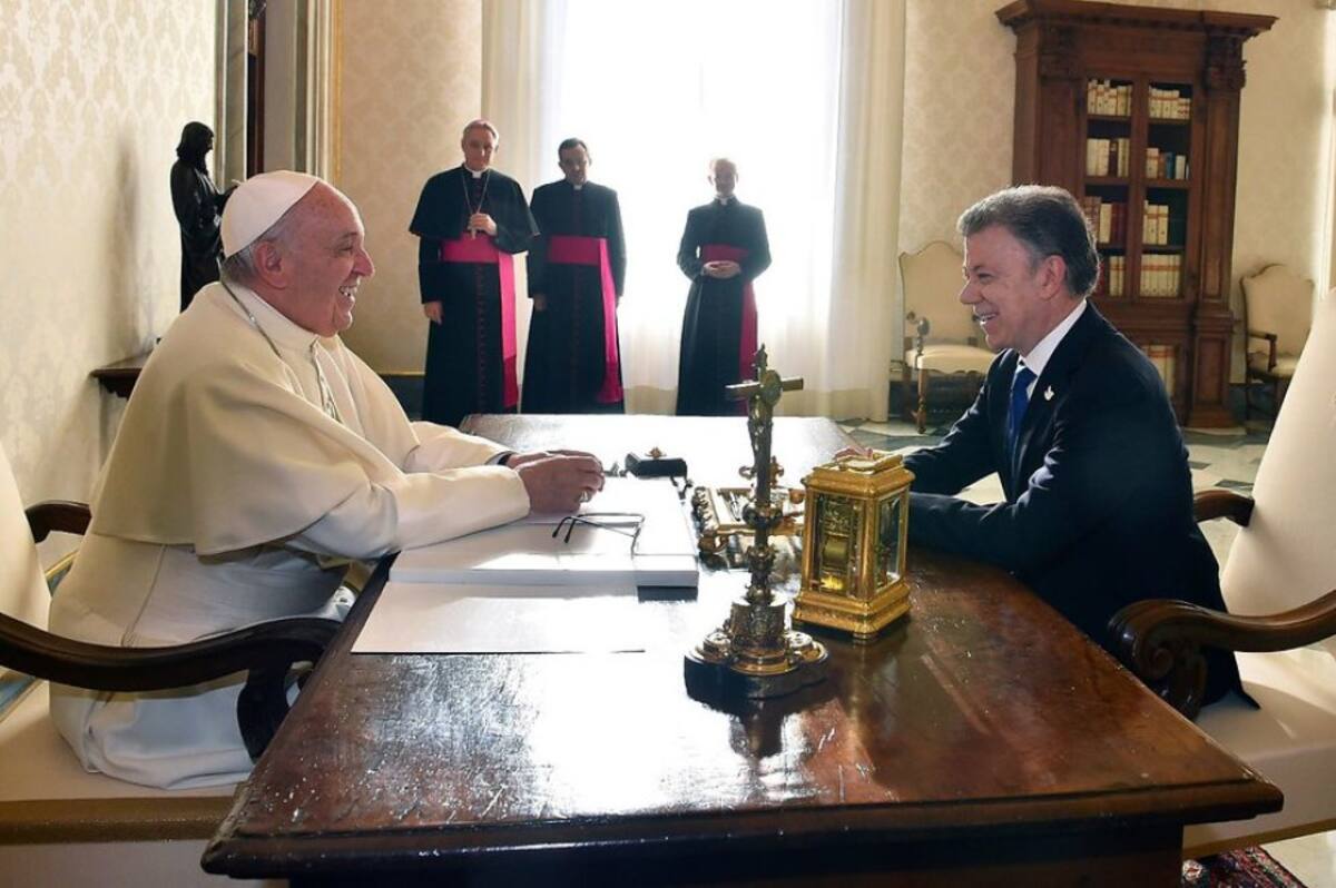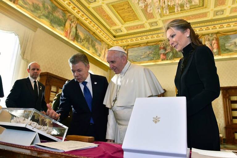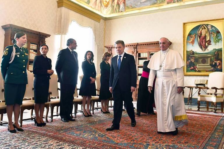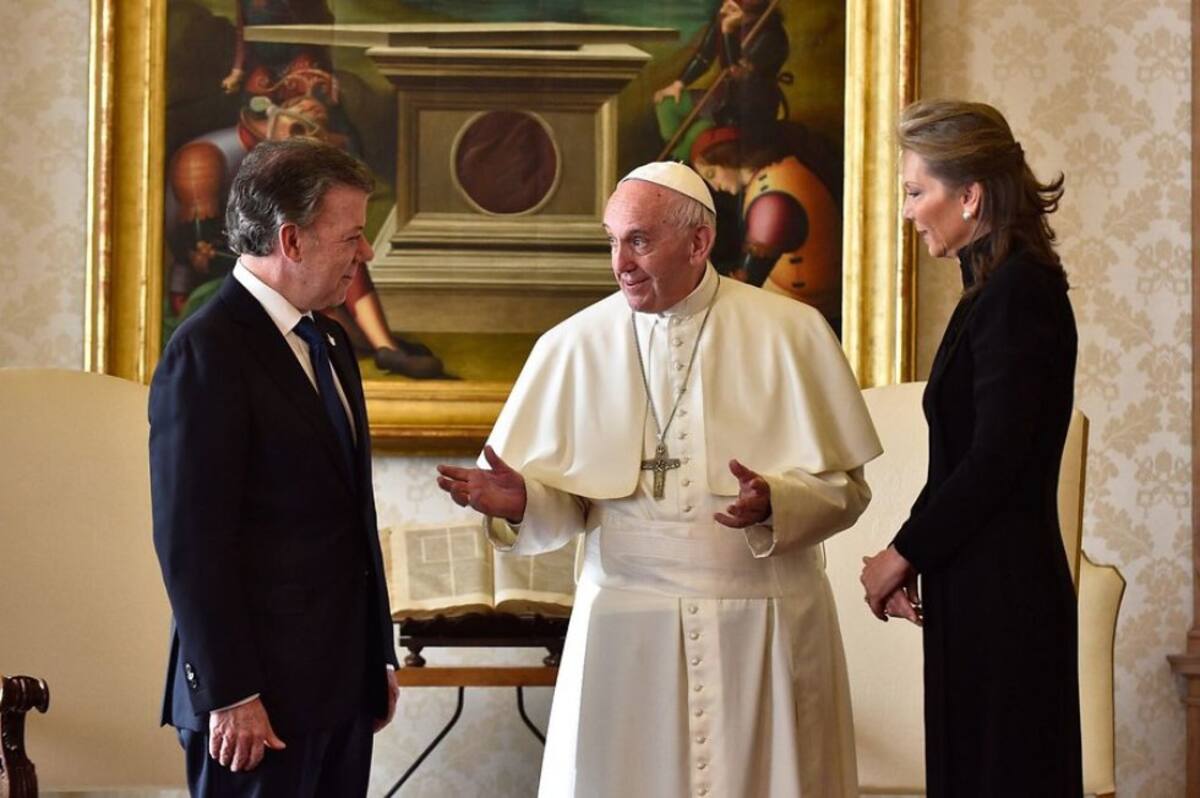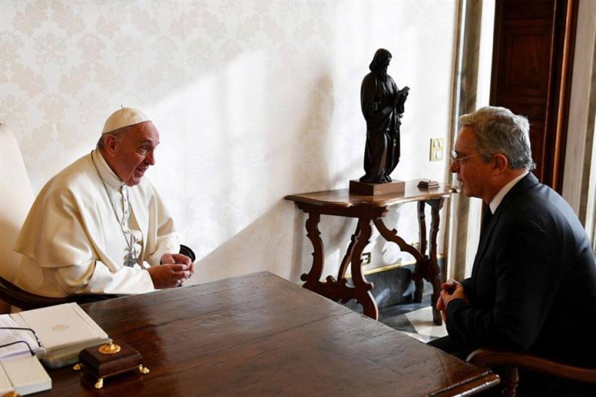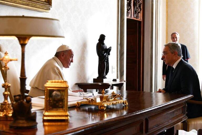 El papa Francisco recibió en audiencia privada al presidente de Colombia, Juan Manuel Santos, y al expresidente Álvaro Uribe, con quienes conversó durante treinta minutos en el palacio apostólico del Vaticano.
