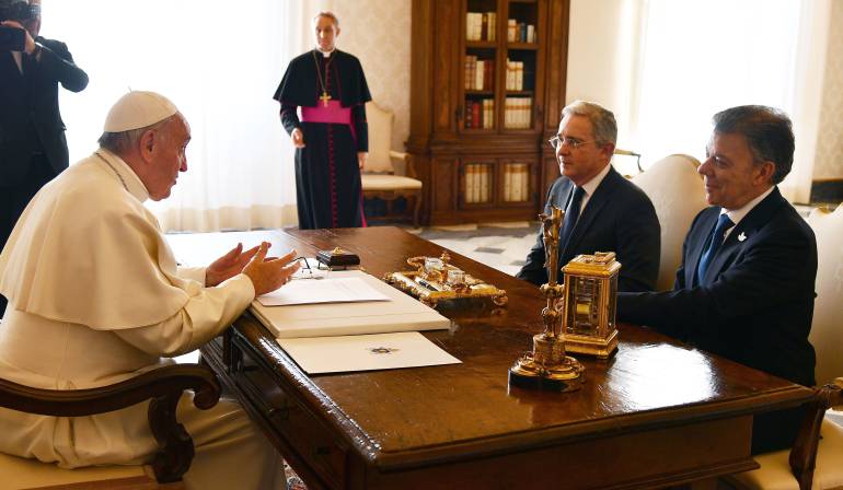 El papa Francisco recibió en audiencia privada al presidente de Colombia, Juan Manuel Santos, y al expresidente Álvaro Uribe, con quienes conversó durante treinta minutos en el palacio apostólico del Vaticano.