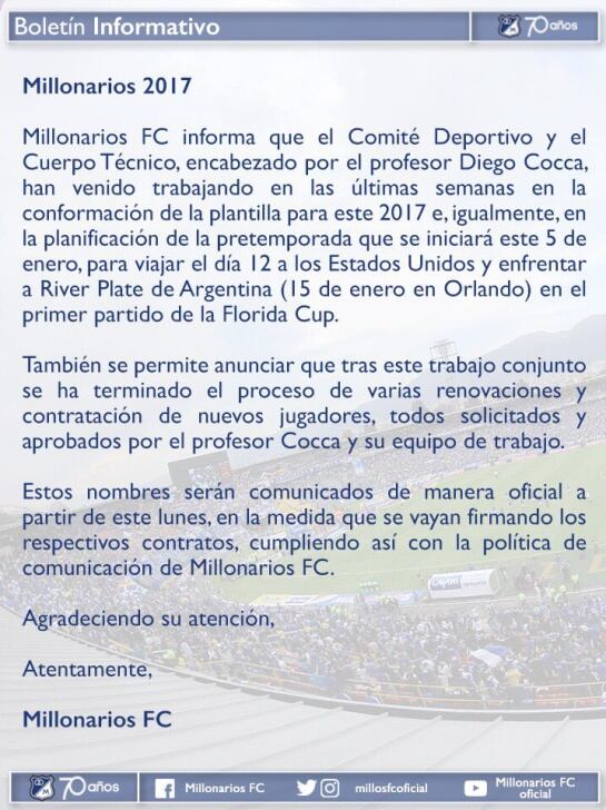 Sin embargo, en el presente comunicado, Millonarios ha informado que “el Comité Deportivo y el Cuerpo Técnico, encabezado por Diego Cocca, han venido trabajando en la conformación de la plantilla para este 2017” y agrega: “tras este trabajo conjunto se ha terminado el proceso de varias renovaciones y contratación de nuevos jugadores, todos aprobados y solicitados por el profesor Cocca y su equipo de trabajo”.