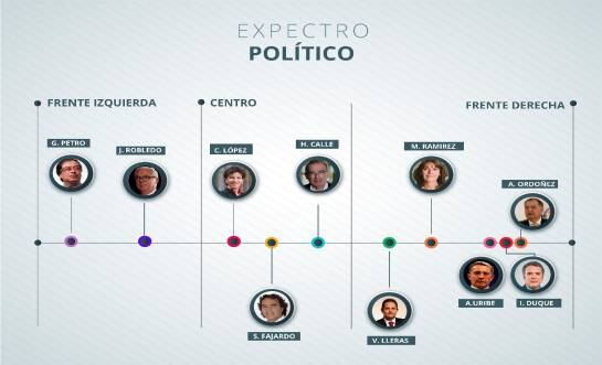 Pero Vargas Lleras no es el único damnificado con los resultados del plebiscito. Tal vez los grandes perdedores, son lo que se creen ganadores del No: Marta Lucia Ramírez y Ordoñez. Estos dos personajes que se sienten más ganadores que Uribe en las toldas del No, al final tendrán muchas dificultades para proyectarse políticamente como una opción viable en el 2018. El argumento es sencillo; el mejor representante de la derecha colombiana y el que hizo la campaña del No fue Uribe y los votos se irán para Iván Duque. Las encuestas, a medida que se acerquen los comicios del 2018 van a moler a Ordoñez y Marta Lucia. Y toda la derecha terminará apoyando al candidato del uribismo. El siguiente diagrama muestra la distribución ideológica de los candidatos para el 2018.