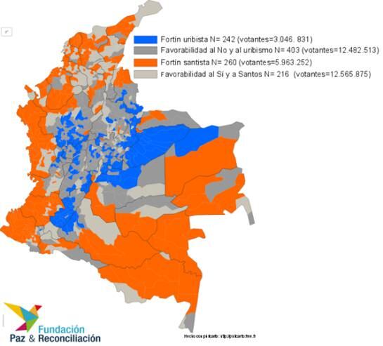 Pero el mapa, además, deja ver que si bien hay más municipios con favorabilidad por el No y por Zuluaga, en términos potencial de votantes tienen básicamente lo mismo que la favorabilidad del Sí y de Santos. Esta última categoría está compuesta por muchas ciudades "voto urbano", esto representa un panorama muy reñido para el 2018.