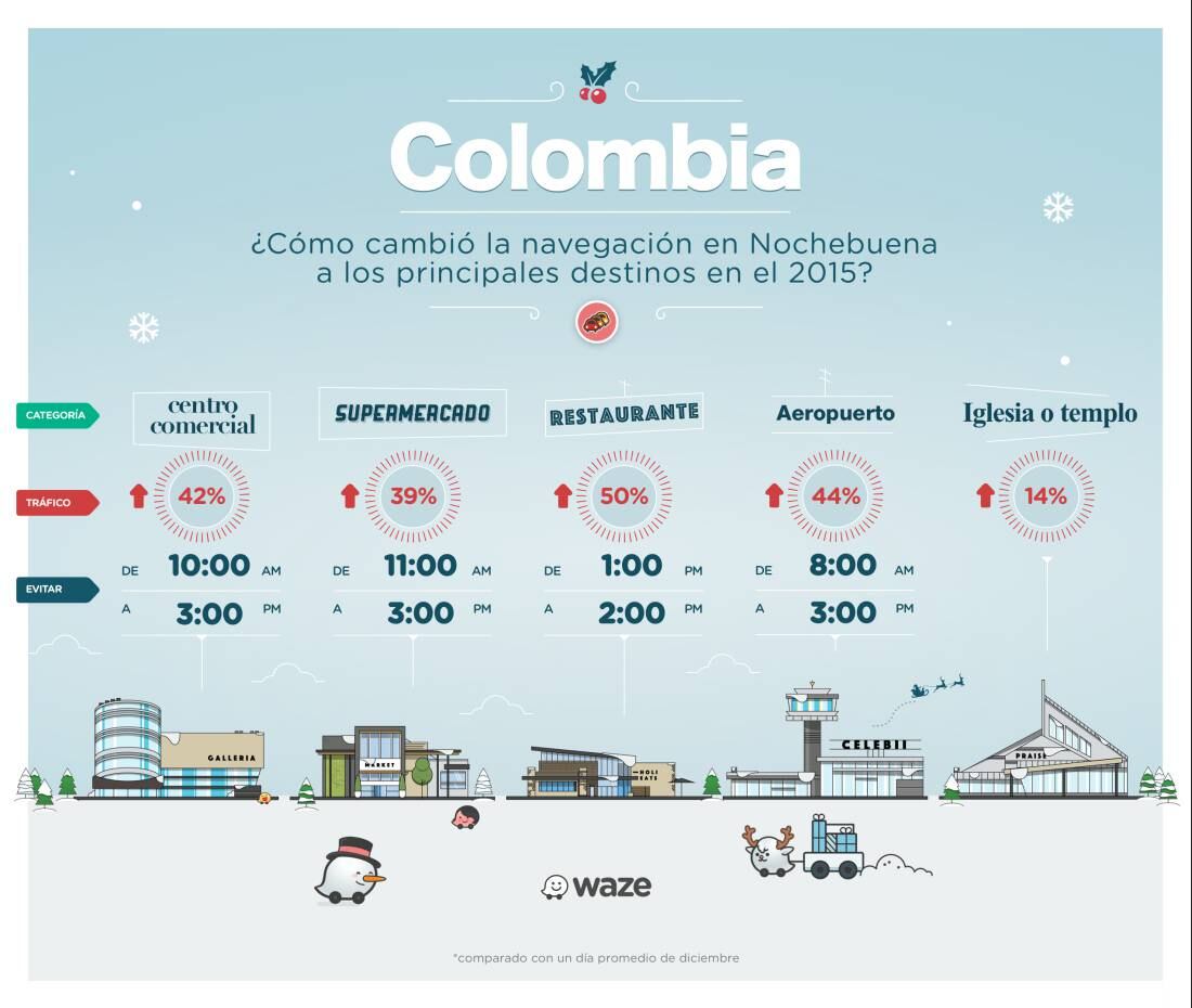 Consulte esta infografía de Waze sobre cómo ha cambiado el tráfico en centros comerciales, supermercados, restaurantes y el aeropuerto durante diciembre.