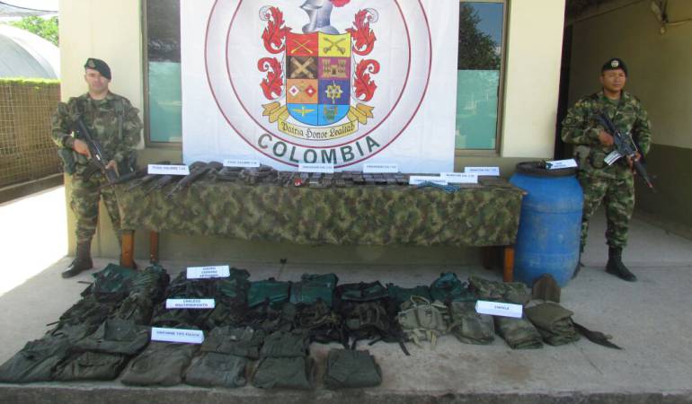 La operación se logró en la vereda Buenos Aires, de este municipio fronterizo del departamento de Arauca, donde los militares de la Brigada Móvil N° 5, tras la revisión del lugar logró la incautación de siete armas largas tipo Fusil, calibre 5.56 milímetros y calibre 7.62 milímetros, 301 cartuchos de estos mismas referencias, 28 proveedores, así como abundante material de intendencia y comunicaciones.