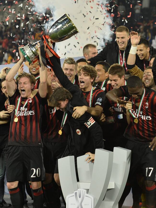 Foto 7 de 10Los jugadores de Milan levantando el trofeo de campeones de la Supercopa Italia.